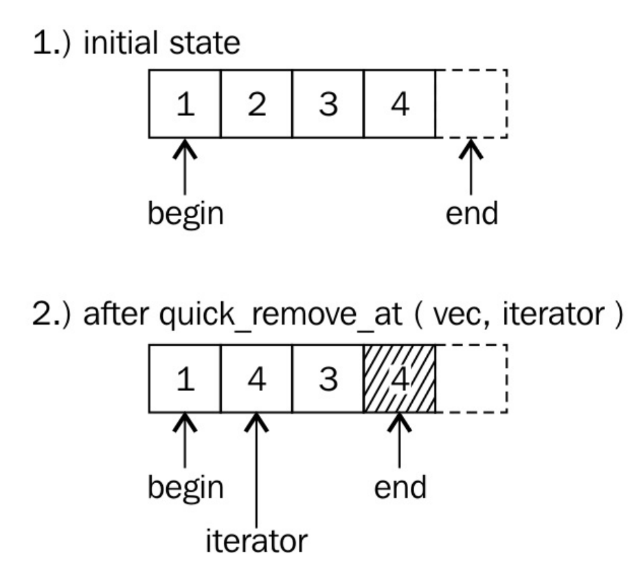 quick_remove_at函数移除元素非常快,而且不需要动其他元素。这个函数使用了更加具有创造性的做法:这是一种与实际元素交换的方式,然后将最后一个元素从vector中删除。虽然,最后一个元素与选中的元素没有实际的关联,但是它在这个特别的位置上,而且删除最后一个元素的成本最低!vector的长度在删除完成后,也就减少1,这就是这个函数所要做的。并且无需移动任何元素。看一下下面的图,可能有助于你理解这个函数的原理。