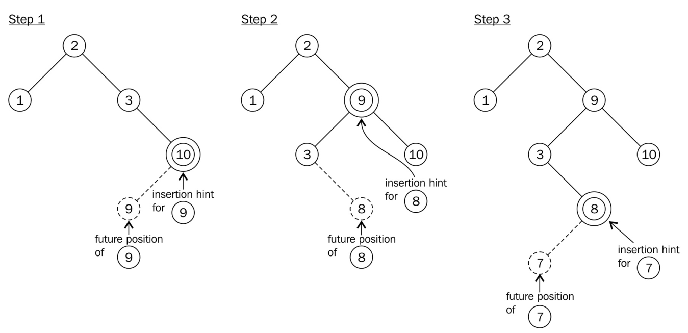 正确的迭代器将会指向一个已存在的元素,其值要比要插入元素的键大,所以新元素会插在这个迭代器之前。如果用户提供的迭代器位置有误,那么插入函数会退化成未优化的版本,其时间复杂度恢复O(log(n))。
