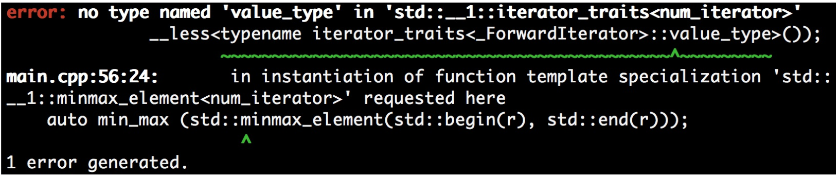 std::minmax_element。这个算法会返回一个std::pair,其具有两个迭代器:一个指向最小值的迭代器和一个指向最大值的迭代器。在这个范围中100和109即为这两个迭代器所指向的位置。auto min_max(minmax_element(r.begin(), r.end())); cout << *min_max.first << " - " << *min_max.second << '\n'; }我们在编译的时候遇倒如下的错误信息。这个错误与