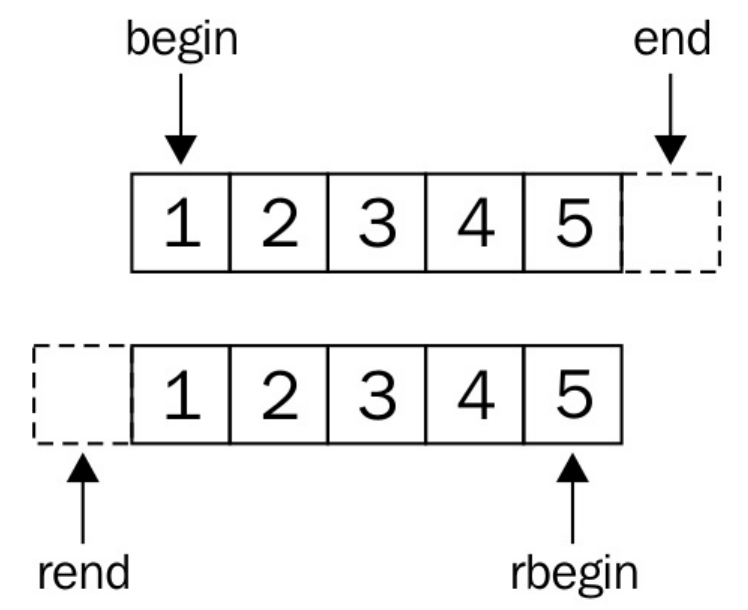 如果序列是从1到5,begin迭代器将指向元素1所在的位置,并且end迭代器将指向元素5后面的位置。当定义了反向迭代器,rbegin迭代器就指向了元素5,并且rend迭代器指向元素1之前的位置。可以将书反过来看,可以发现这两个中方式是镜像的。