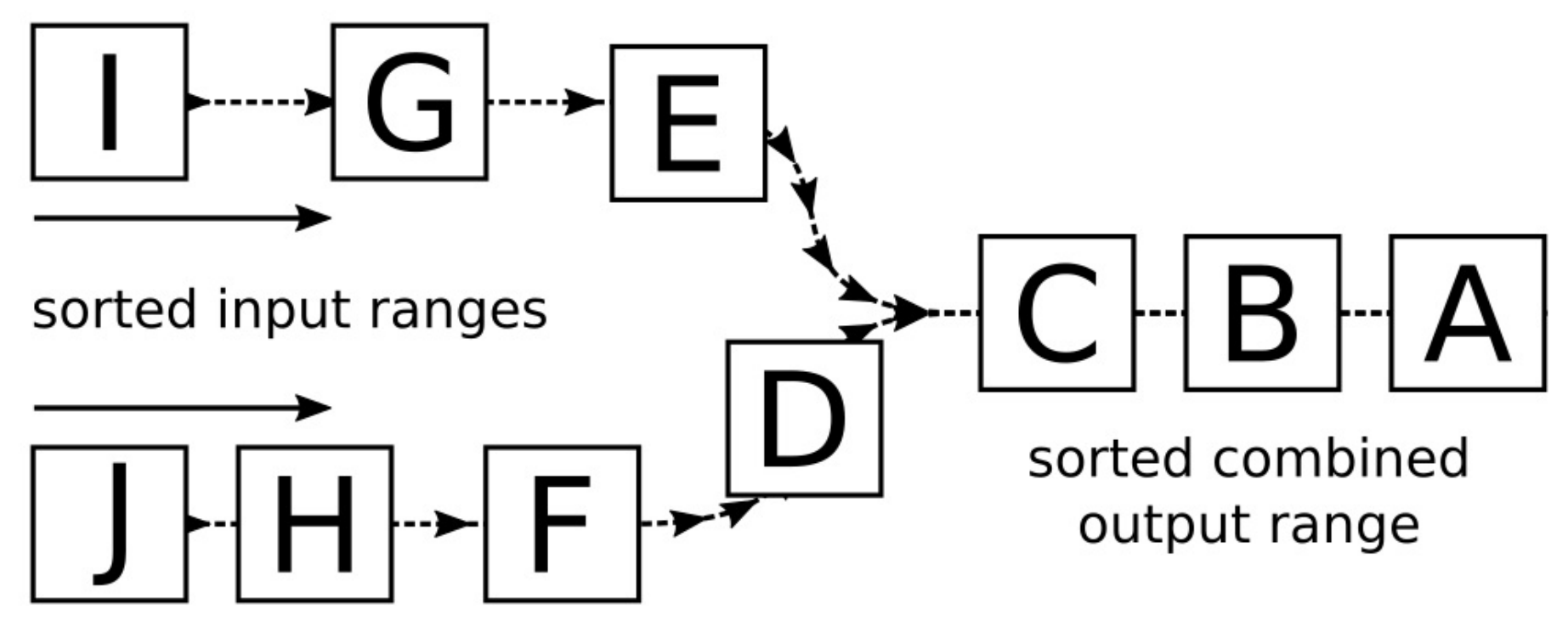 其有一个变体std::inplace_merge。两个算法几乎一样,不过这个变体只需要一对迭代器,并且没有输出,和其名字一样,其会直接在输入范围上进行操作。比如对{A, C, B, D}这个序列来说,可以将第一个子序列定义为{A, C},第二个子序列定义为{B, D}。使用std::inplace_merge算法将两个序列进行合并,其结果为{A, B, C, D}。