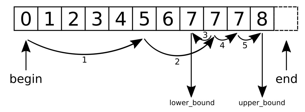 来看一下std::equal_range是如何工作的。假设我们有一个vector,v = {0, 1, 2, 3, 4, 5, 6, 7, 7, 7, 8},并且调用equal_range(begin(v), end(v), 7);,为了执行对7的二分查找。如equal_range要返回一对上下限迭代器那样,这个结果将返回一段区域{7, 7, 7},因为原始vector中有很多7,所以这个子队列中也有很多7。下图能说明其运行的原理: