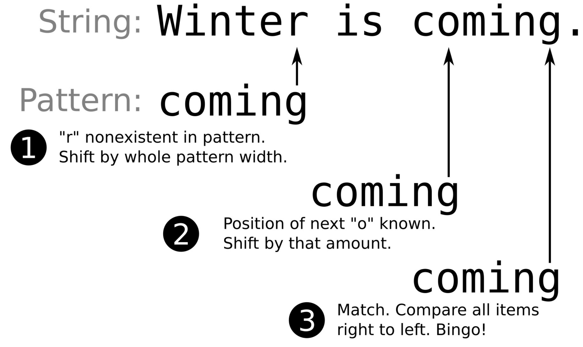 Boyer-Moore-Horspool为简化版的Boyer-Moore算法。其丢弃了“坏字符”规则,当对应字符串没有找到时,将会对整个查找块进行偏移。需要权衡的是,这个算法要比Boyer-Moore算法慢,但是其不需要对那么多特殊的数据结构进行操作。