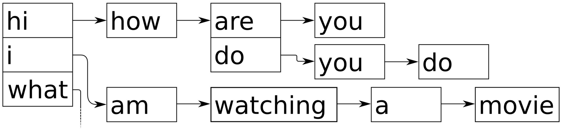 让我们看下下图,这里有两个句子“hi how are you”和“hi how do you do”,存储在一个类似于树的结构体中。其都以“hi how”开头,句子后面不同的部分,划分为树结构: