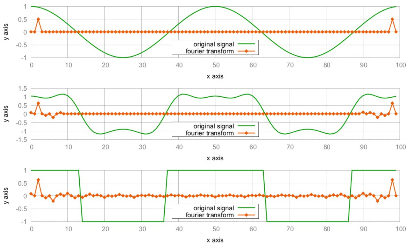 auto cosine (signal_from_generator(sig_len, gen_cosine( sig_len / 2))); auto square_wave (signal_from_generator(sig_len, gen_square_wave(sig_len / 2)));那么现在有了两个波形信号。为了生成第三个信号,我们对方波信号进行傅里叶变换,并且保存在