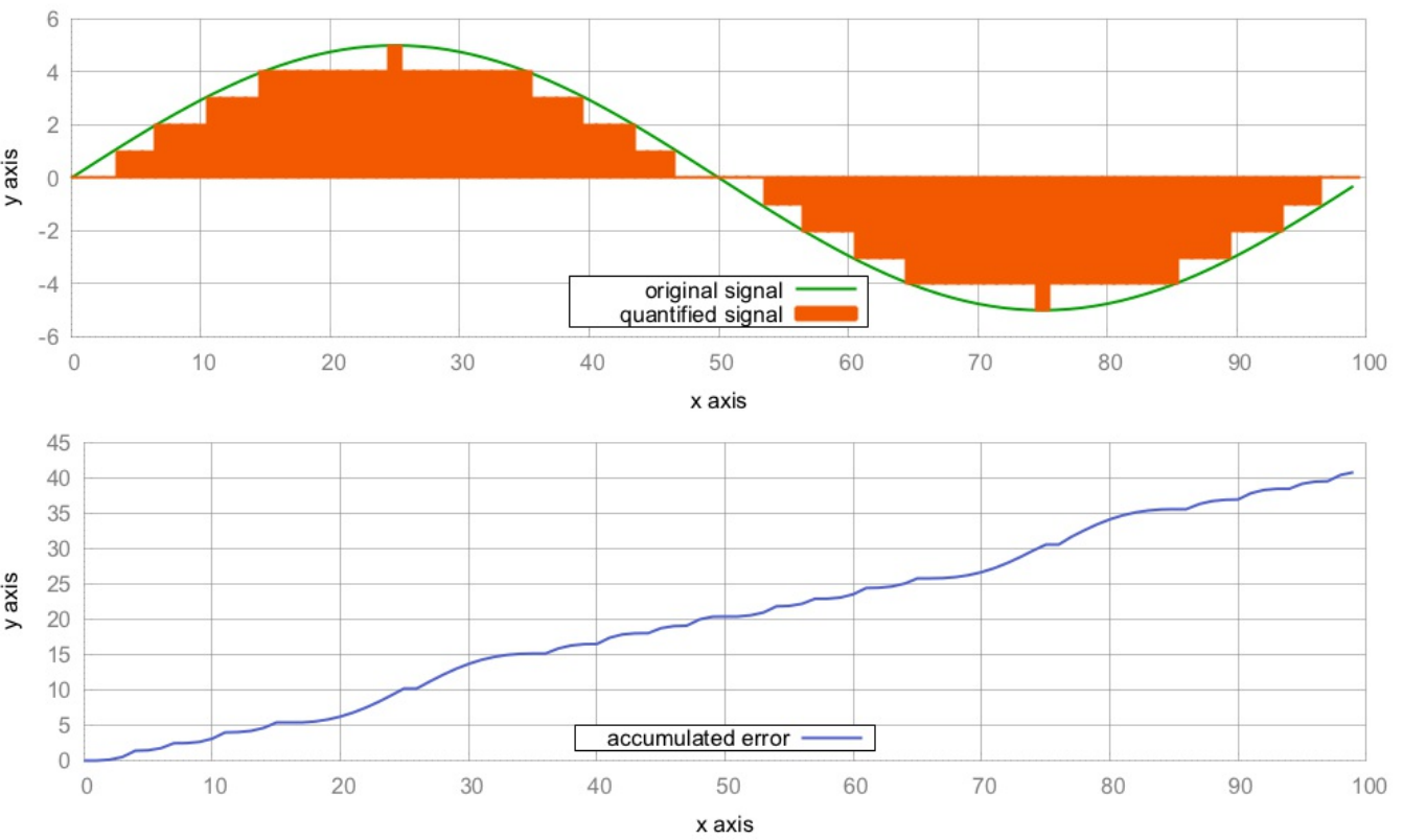 sine,另一个信号也是sine,不过其中之一的使用double类型进行保存,另一个使用int类型进行保存。因为double和int类型表示数值的范围有差异,就像是模拟信号as转换成数字信号ds。int main() { const size_t sig_len {100}; vector<double> as (sig_len); // a for analog vector<int> ds (sig_len); // d for digital为了生成一个