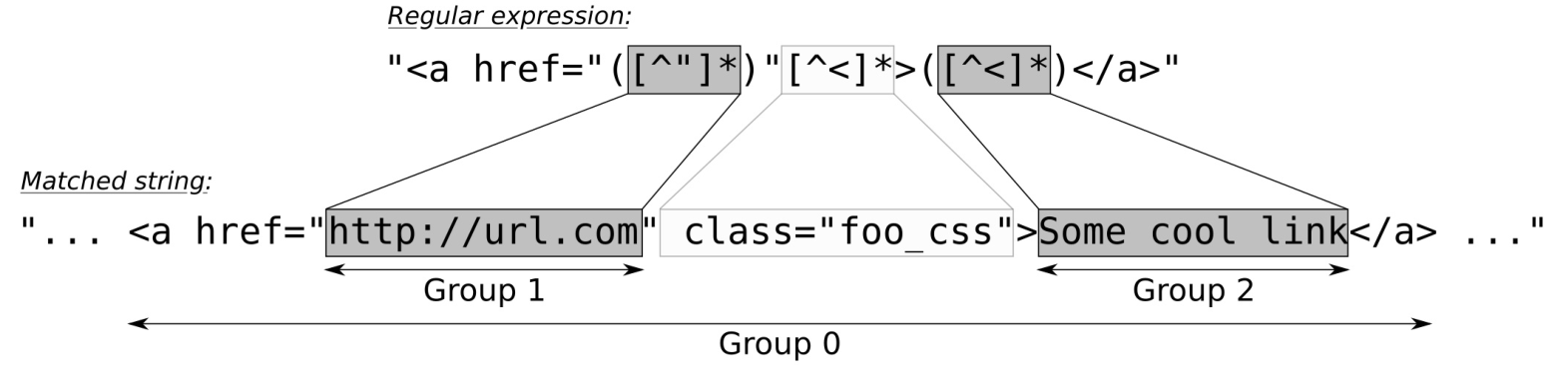 让我们来看一下本节中的正则表达式,是如何对HTML连接进行匹配的。一个简单HTML连接可写为<a href="some_url.com/foo">A great link</a>。我们只需要some_url.com/foo和A great link部分。所以,我们可以使用如下的正则表达式进行匹配,其会将字符串对应每个组,从而分解成多个字符串: