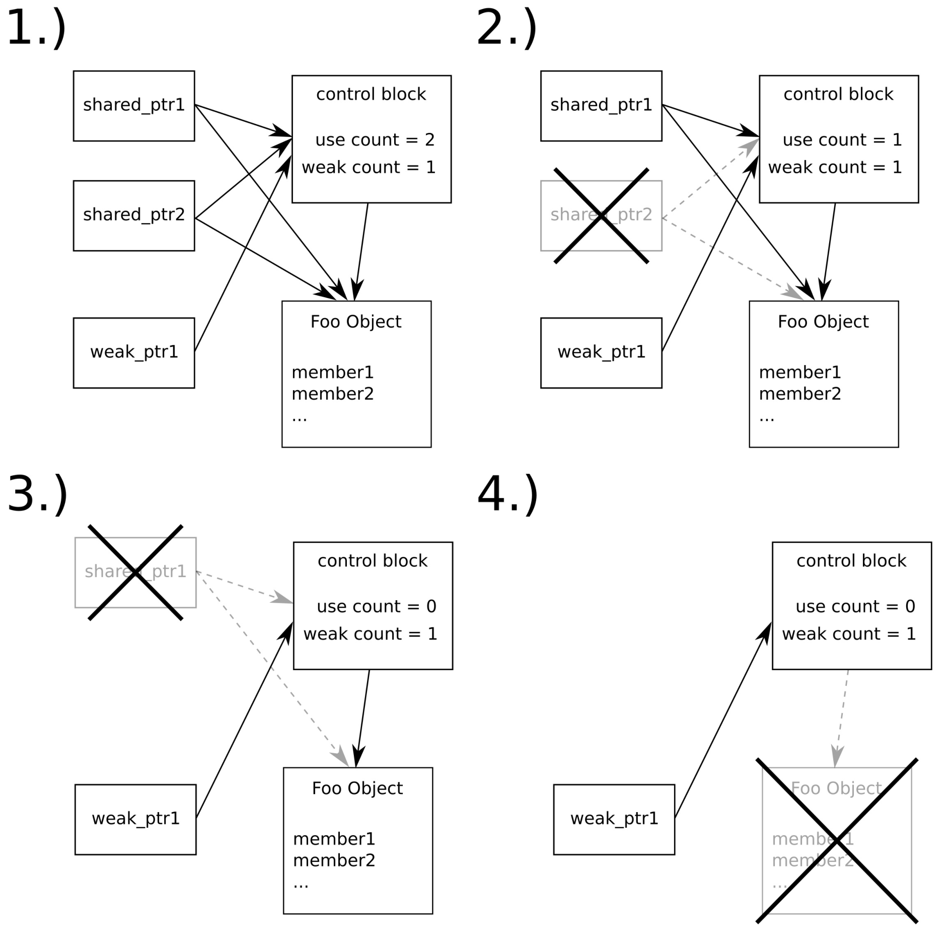 流程与共享指针的图类似。第1步中,我们有两个共享指针和一个弱指针,都指向Foo类型的实例。虽然有三个指针指向这个对象,但是其共享指针引用数依旧为2,弱指针在控制块有属于自己的计数器。第2和3步中,共享指针的实例被销毁,这步将会让引用计数归0。第4步,Foo对象也被销毁了,不过控制块依旧存在。因为弱指针依旧需要控制块来对其是否悬垂进行判断。只有当最后一个指向对象的弱指针被销毁,那么控制块才会被销毁。
