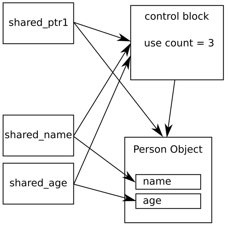 注意shared_ptr1是直接指向person对象,而shared_name和shared_age则指向的是同一个对象的name和age成员变量。显然,这些指针管理着整个对象的生命周期。可能是因为内部控制块都指为同一个控制块,这样就无所谓是否仅指向对象的子对象了。