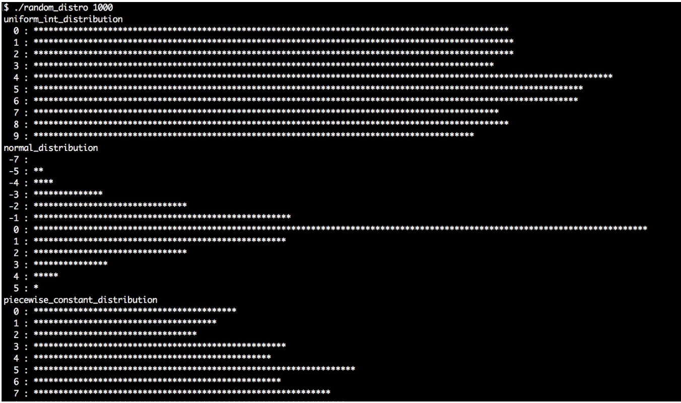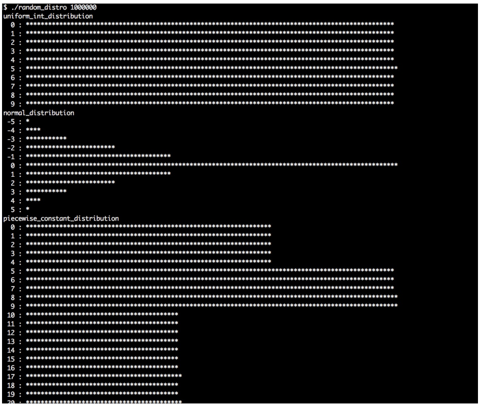 不过,当具有一个已经实例化的分布时,我们可以像函数一样对其进行调用(只需要一个随机数引擎对象作为参数)。然后,随机数生成引擎会生成一个随机数,通过特定的分布进行对随机值进行限定,然后得到了所限定的随机数。这就导致不同的直方图具有不同的分布,也就是我们程序输出的结果。