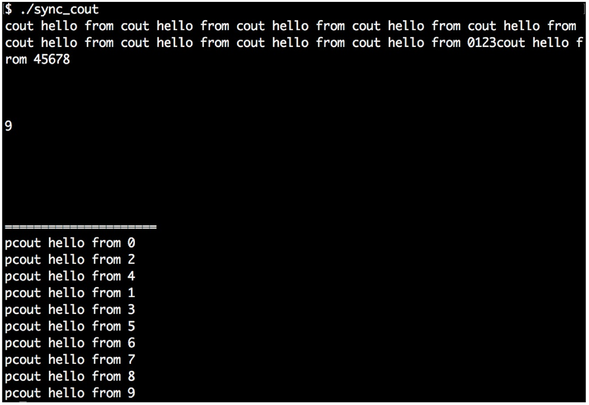 print_cout,其会使用cout进行打印。我们并发的启动10个线程,使用其打印相应的字符串,并等待打印结束:int main() { vector<thread> v; for (size_t i {0}; i < 10; ++i) { v.emplace_back(print_cout, i); } for (auto &t : v) { t.join(); }然后,使用